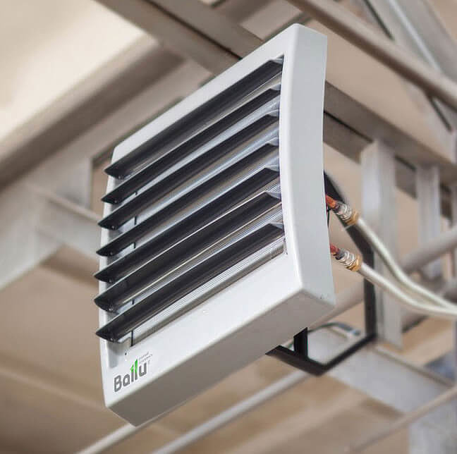 Водяной тепловентилятор Ballu BHP - практичный обогрев для больших площадей. Во-первых, воздух нагревается за счет тепла горячей воды. При этом электричество расходуется только на движение вентилятора. Поэтому такое отопление является одним из наиболее выгодных. Во-вторых, одно устройство может выдавать от 10 до 100 кВт тепла. Что позволяет поддерживать комфортную температуру на площади до 100 кв.м. В-третьих, тепло можно направить в нужную зону. Особенно это полезно для отопления зданий с высокими потолками.