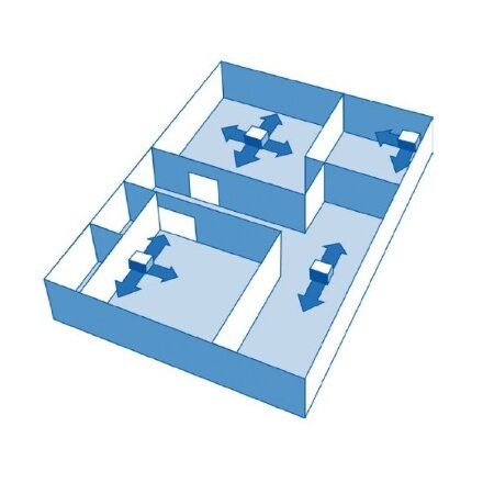 - Распределение воздуха. Если закрепить внутренний блок кондиционера Daikin FUA71A/RQ71BV на стене, то поток охлажденного или нагретого воздуха будет двигаться сначала вверх, затем вдоль потолка. Если же подвесить консоль на кронштейнах под потолком, это позволит создать длинную воздушную струю вдоль комнаты. Постепенно поток будет опускаться вниз, создавая комфортный и равномерный температурный фон по всей площади.